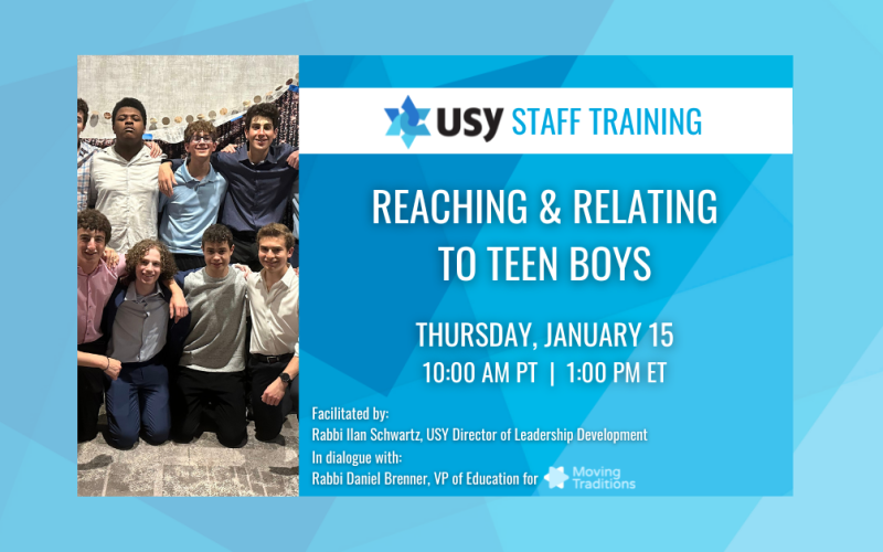 Join USY’s Rabbi Ilan Schwartz in dialogue with Rabbi Daniel Brenner, VP of Education for Moving Traditions, as they discuss strategies for engaging boys in Jewish life and keeping them involved. We’ll discuss the obstacles to teen boys’ involvement, the dangers of assuming that boys want a certain type of programming, and the frameworks that are working to support them.