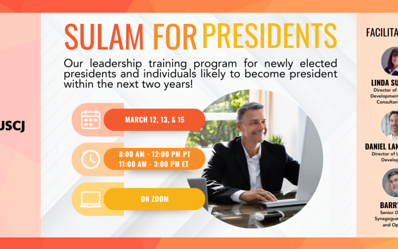 Over the three days, create a shared bond with other new synagogue presidents. Participants will develop action plans that can be implemented in your congregation, gain knowledge on topics such as mission, vision, board development, strategic thinking, change management, fundraising, and financial sustainability.