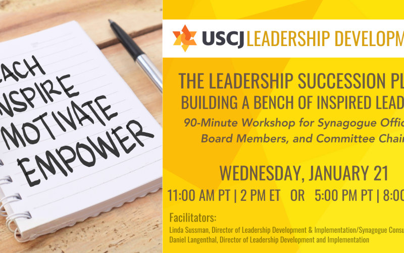 Sustaining vibrant synagogue leadership requires more than filling positions—it calls for cultivating relationships, mentoring emerging leaders, and making leadership both meaningful and accessible. This interactive workshop will guide officers, board members, and committee chairs in developing a thoughtful leadership succession plan that strengthens your congregation’s capacity for the future.
