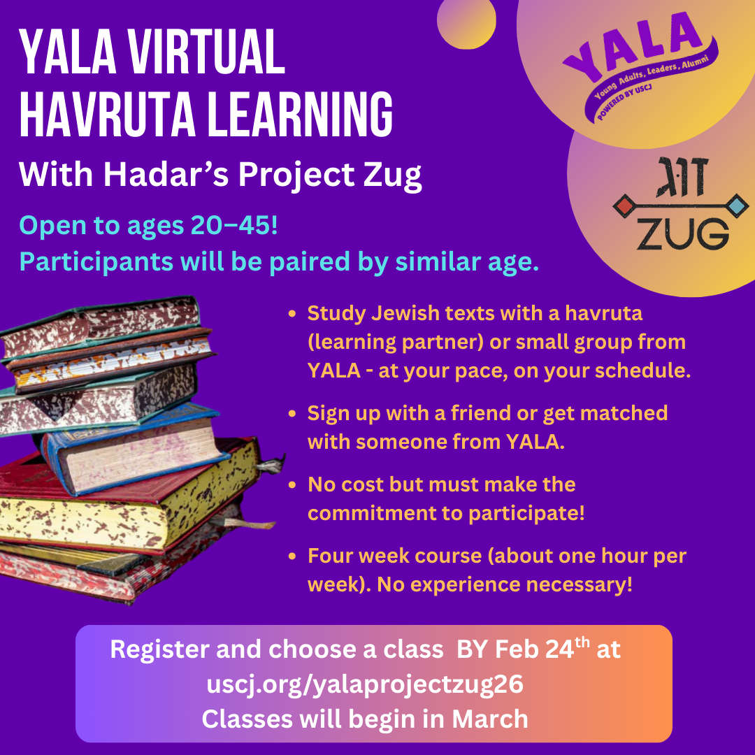 YALA, in partnership with Project Zug, is excited to offer an opportunity for meaningful Jewish learning, from the comfort of your home.